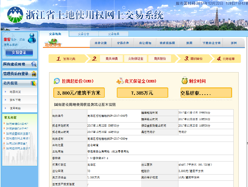 12月22日,定海区招拍挂地块SF-2017-008号地块通过浙江省土地使用权网上交易系统顺利成交,这是定海区实施首宗国有土地使用权网上交易。该地块位于定海区盐仓街道昌洲大道南侧,土地总面积40487.7平方米,规划土地用途及出让年限为住宅用地70年、商服用地(批发零售用地等)40年,起始楼面地价3800元/平方米,宁波市海曙亿发企业管理咨询有限公司以楼面地价4380元/平方米,总价4.26亿元摘牌成交,溢价率15.3%。我区首次国有建设用地使用权网上交易成功,标志着我区的土地交易市场实现了从线下到线上的跨越。相较于传统现场交易模式,网上交易全过程通过互联网封闭运行,其流程更加公开透明,为竞拍人不仅营造一个公平、有序、保密的竞买环境,还降低了交易成本,提高了竞买效率。